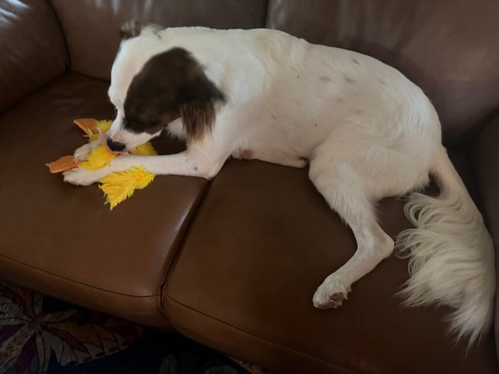 Every dog is different, but you can probably get a good sense of what will work for your dog by reading Pearl’s Picks + Kailani’s Destruction Ratings. The most indestructible and beloved toy of this month has been the already-flat duck. No crinkles or stuffing or squeakers to eviscerate, but with four satisfyingly squidgy felted feet and one beak to chew, and a soft, fluffy, floppy skin to flap around while running through the room, careening off the couch, and knocking over a lamp or two that shouldn’t have been there in the first place.